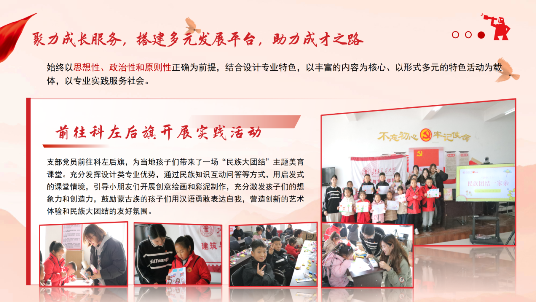 结合建筑与艺术专业特色,支部组织党员将专业所长转化为服务社会的实际行动:赴北京密云区开展乡村儿童艺术启蒙活动,为乡村孩子播撒美育种子;深入科左后旗打造“民族大团结”美育课堂,通过绘画、彩泥创作等生动形式,在艺术实践中促进民族团结,以实际行动践行青年党员的社会责任。
