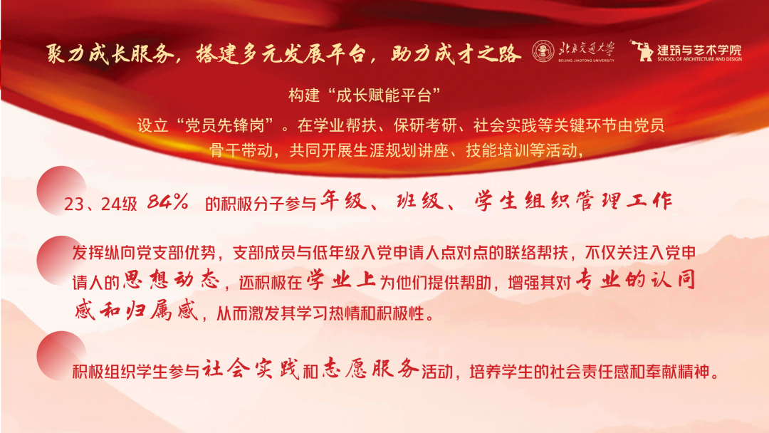 党建引领聚合力,奋发有为践初心。在喜迎中国共产党成立104周年之际,建筑与艺术学院党委集中展示师生党支部建设成果,进一步彰显师生党员积极进取、勇担时代使命的责任担当。其中,本科生第二党支部以“思想铸魂、价值引航、成长赋能”为核心,探索形成特色党建工作路径,用扎实实践书写了新时代学生党支部的责任与担当。