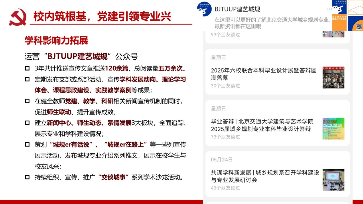 北京交通大学城乡规划系教师党支部共有党员教师13人,支部始终紧扣立德树人根本任务,通过夯实基础、凝聚力量、强化实践,推动学科与党建深度融合。支部围绕学科发展、文化传承与社会需求,探索 “师生协同、校地融合、校企共建”多维创新机制,成效显著。