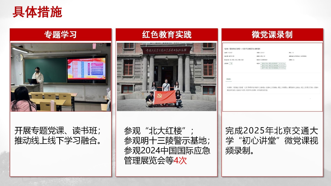 在专题学习方面,开展专题党课、读书班等;在红色教育实践中,我们走进“北大红楼”、明十三陵警示基地等,累计开展4次实地研学;完成2025年北京交通大学“初心讲堂”微党课视频录制,以创新形式传播红色声音。